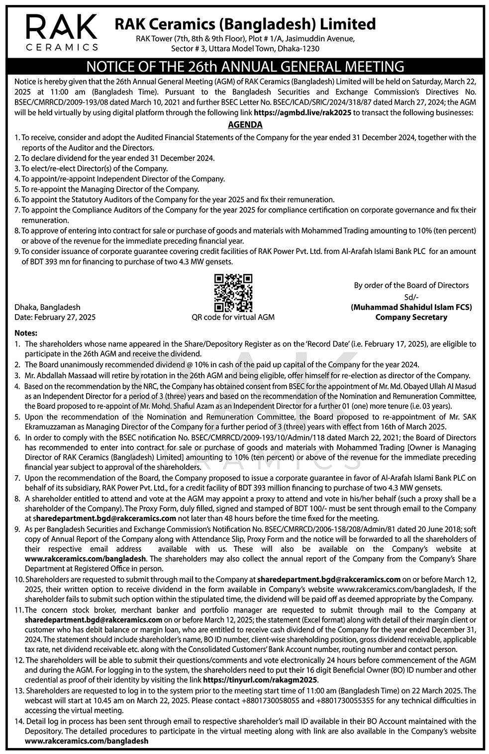 ঘোষিত লভ্যাংশ শেয়ারহোল্ডারদের সম্মতিক্রমে অনুমোদনের জন্য কোম্পানিটির বার্ষিক সাধারণ সভা (এজিএম) আগামী ১৫ জানুয়ারী ২০২২ সালে অনুষ্ঠিত হবে। এ সংক্রান্ত রেকর্ড ডেট নির্ধারণ করা হয়েছে ২৫ নভেম্বর ২০২১।